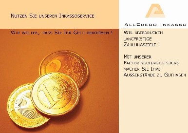 Forderungsinkasso erhöht die Liquidität. AllCredo Inkasso hilft Ihre Aussenstände zu verringern. Inkasso und Mahnwesen von der außergerichtlichen Mahnung bis zum Mahnverfahren. Auch Factoring dient zur Liquiditätssteigerung. Presseberichte und Gesetzänderungen.